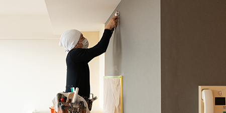 壁や天井に用いられている材質によって材料を選定し、下地処理を行い本塗装していきます。